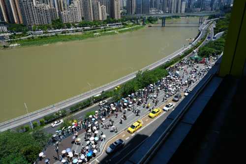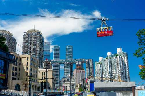 まぁ京都も同じようなもんよな。 とりあえず暑いのでスタバでココアを飲んでから、どんどんと歩き回る。 そして帰ろうかなという段になって、 道に迷い、無駄にめちゃくちゃ歩き回ってようやく帰路についた時には、 相当に汗だくになってしまっていたのだった。 こりゃもう疲れ果てた。 博物館とかは止めて、ホテルで夜景の時間まで休憩しよう。 帰りながら少しだけ撮影。 重慶の一番の繁華街は丘のようになっていて、結構坂道や階段が多い。 部屋から見える長江を渡るロープウェーを撮ってからホテルまでは結構な坂道だった。