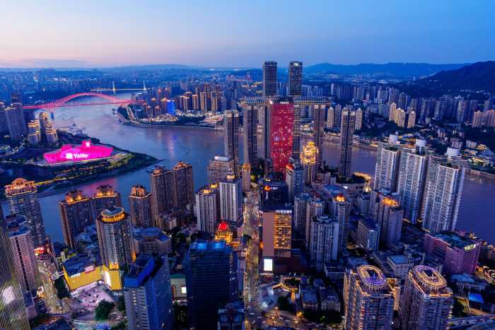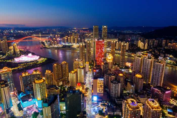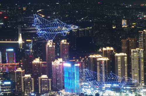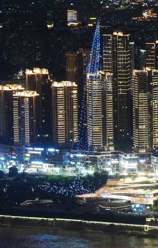 で、21:00からドローンショーがあるのを知っていたので、そのまま待機。 つい先日、一万機以上のドローンを使ったショーがギネスになったそうな。 洪崖洞の近くで見ようと思ってたけど、思ってたより暗くなるのが遅かったので、 今からでは間に合わないのだ。 それにしても美しい夜景であることよ。 マンハッタンといっても過言ではない。 知らない人が見て、ここを中国だと思うことは難しいのではないだろうか。 これは本当にオススメな夜景だ。 そしてドローンショー。 一体何を見せてくれるのかと思いきや・・・空母。