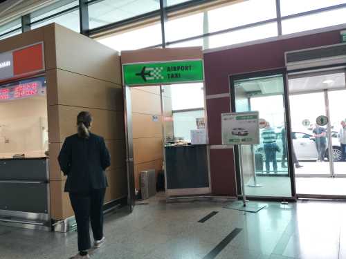 というか、何となく埃っぽい。 コレは機能してない・・・? 1日2本しかないからそんなもんかと思ったら、 後ろからタクシーのおっさんが「列車は来ないぞ!」 と教えてくれた。 乗れ乗れ、とも言っていたが、もう我輩は帰るのだよ。 エアポートタクシーも調査しておこうと到着ターミナルに入ってみたら、 アッサリ見つかった。 コレか・・・。