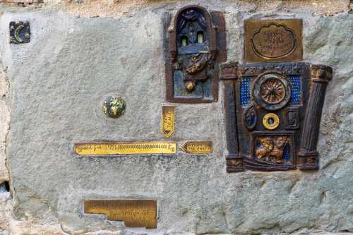 はー、まだ昼か。 そうそう、この劇場の壁で面白いものを発見。 モザイクタイルの脇にある地球の重さって書いてあるプレートの横。