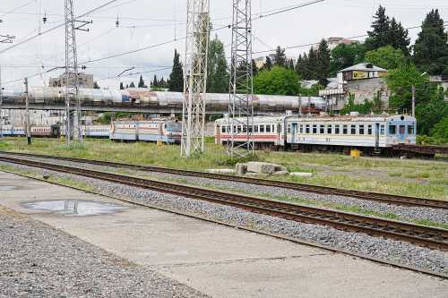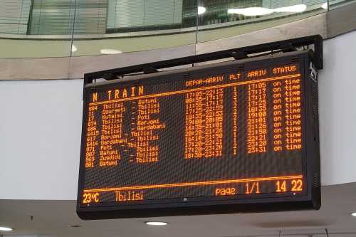 トビリシに行ったら、是非見てきてもらいたいものである。 ブラブラ歩いて、そういえばロープウェーに夜しか乗ってないな・・・と思い立ち、 展望台へ行ってみる。 昼間はさすがにちょっと並んでいるな。 景色はというと、我輩はやっぱり夜が好きではあるのだが、昼間はまぁこんなもんか。 予想通り、という感じ。 さて・・・やる事もないしトビリシの中央駅にでも行ってみますかね。 地下鉄で数駅行ってみた中央駅は、作りだけは立派。