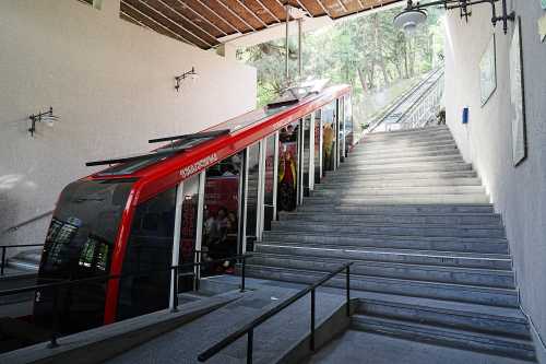 朝と夕方に長距離列車が発着するのみのようだ。 これはつまらん。 即退出。 さてそうしますと、どうしましょ。 そういえば、昨夜展望台から見えたテレビ塔のある高台からも 景色が見えるに違いない。 またしても地下鉄で移動し、延々と坂道を登って、ケーブルカーの乗り場に到着。 山の上は遊園地になっているらしく、 そこへ行く客たちとともにケーブルカーに乗り込む。