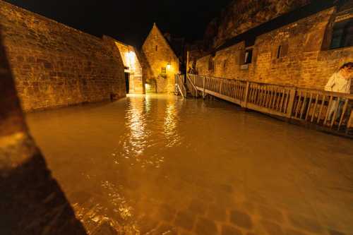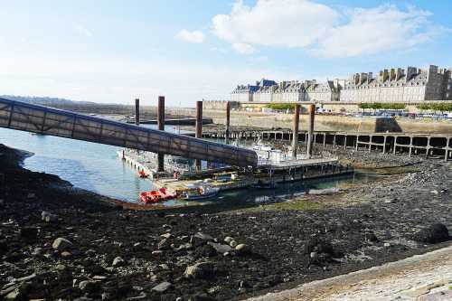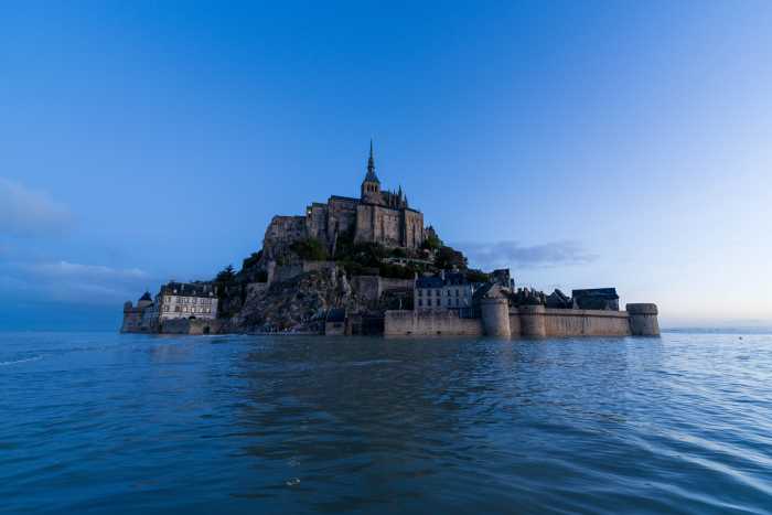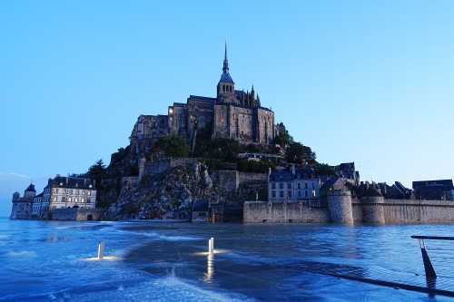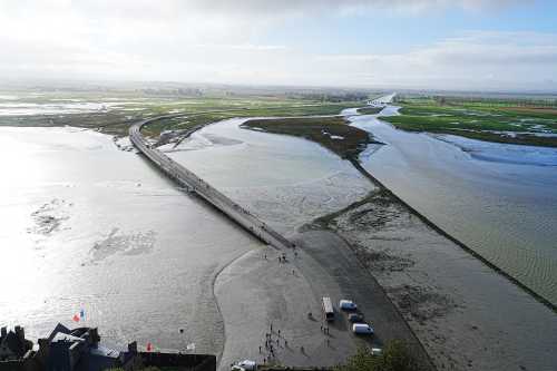 5:30起床。 朝の満潮に備えて準備。 てくてく歩いていくと、もうすでに潮が結構満ちている。 よく参考にされているサン・マロの満潮時間よりも早い時間に行くことを勧める。 そして橋の先端に、そこそこ人がいる。 みんなお早いですこと・・・。 何と橋の先は海になっていて、モン・サン・ミシェルは完全に孤島になっていた。 こんな風になるのか! 写真を撮ると橋の棒が写り込む。 みんなこんなのが写り込んでも気にならないのか? というわけで、あの日本人はアホじゃないかという視線をものともせず、 海水にジャブジャブと浸かって写真を撮った。