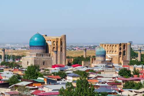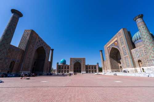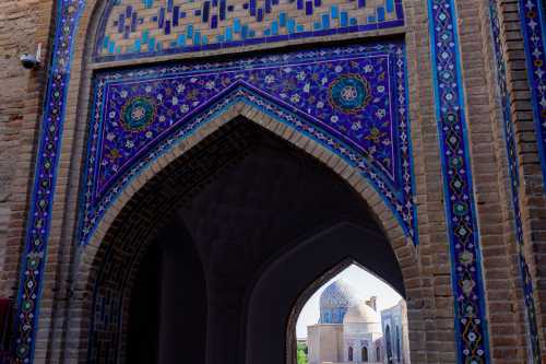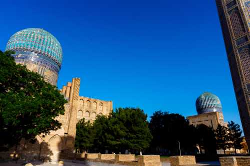 誰の霊廟なんだかよく分からない点はおいといて、 写真を撮りだしたらキリがない実に美しいエリアであった。 そこから少し歩くと、先程ミナレットから見たモスク、ビビハニム・モスクがある。 どれもこれも実に見事な青色のドームで美しい。