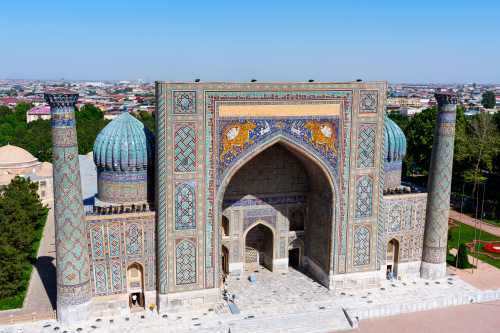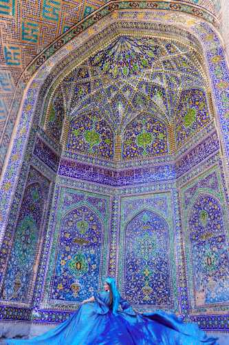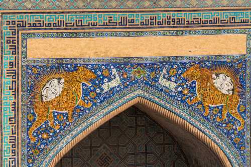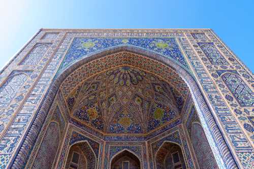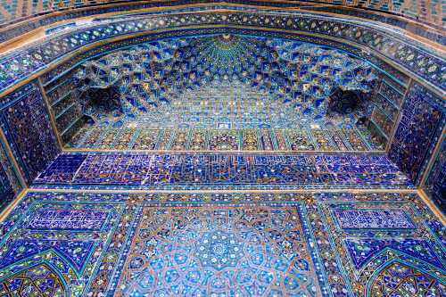 3つのメドレセというイスラム世界でいう神学校が建っていて、 ウズベキスタンを象徴するような広場だと我輩は思う。 まぁ今や中身は土産屋が軒を連ねているのだが。 何色っていうのこれ。 エメラルドブルーっていうのか? 紋様も含めて実に美しい。