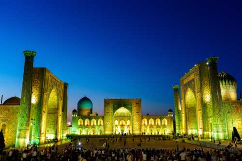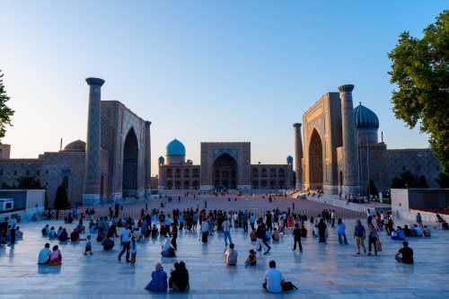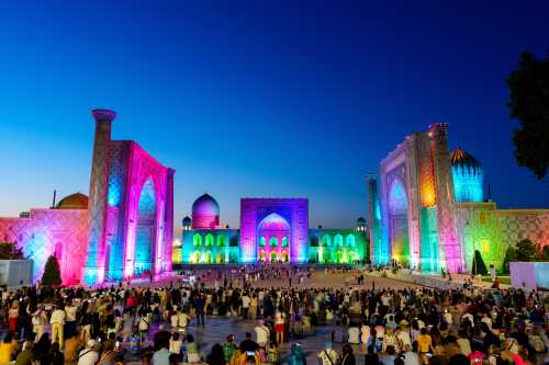 サマルカンド、想像以上である! 堪能してホテルに帰還。 さて、20:00からレギスタン広場でライトアップショーがある。 少しホテルでお休みして、18:30から場所取り。