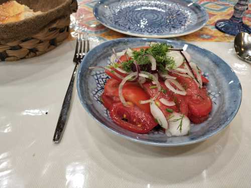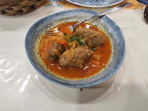 まぁ普通にライトアップしてくれた方が良いかもしれん。 さて晩御飯。 名著地球の歩き方に書いてあるレストランへタクシーで行ってみると、 何だか騒がしい。 フロアはダンスステージみたいになってて、現地の人々が踊りまくっている。 それを取り巻くように飯を食うテーブルがあるのだが、これはさすがに喧しい。 辞去してホテルの近くにあるレストランへ。 ミートシチューにトマト、そしてサマルカンド名物のデッカイパンを食った。