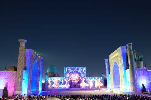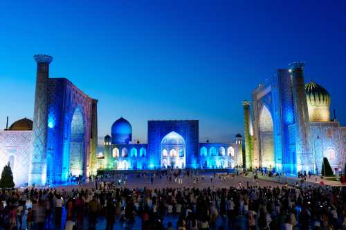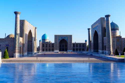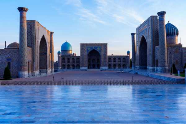 - 5 May 5:00起床。 朝人気のないレギスタン広場の写真を撮りたい。 日が昇るのを待って撮影。 おぉ・・・。 床にうっすらとメドレセが映り込んで実に美しい。 そして、このすぐ後に広場の中で写真撮影やらが始まってしまい、 このチャンスは本当に僅かな時間しかなかった。 危ないところであった。 快適なホテルをチェックアウトし、タクシーで駅に向かう。