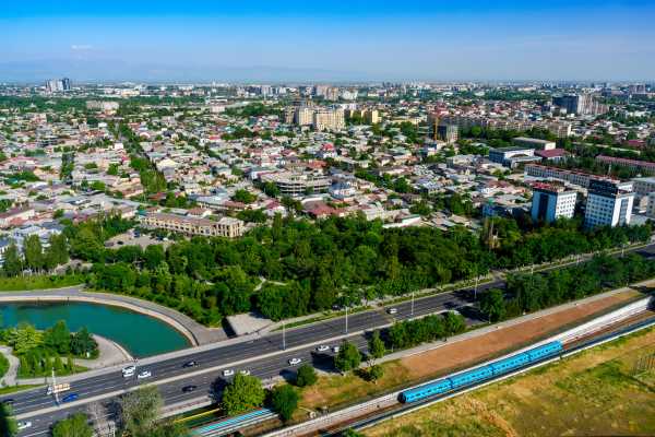 手荷物検査を受けて、 モンゴルっぽい見た目のオバサン達に順番を抜かされまくりながら展望台へ。 タシケントの街が一望できる。 どうせもうほかに行く所がないので、 足下を走る地下鉄や貨物の写真を撮ったろうと粘る。 旧式?の青いのが映えるので、待って待って撮影した。